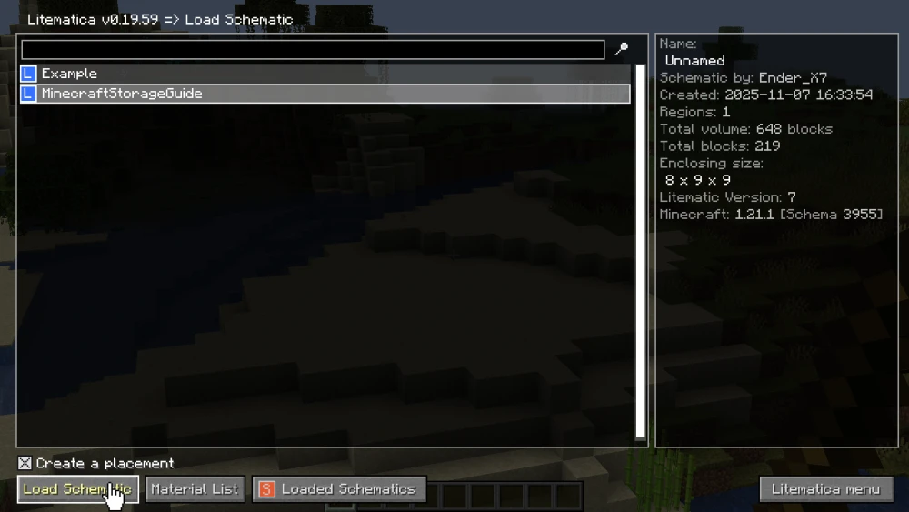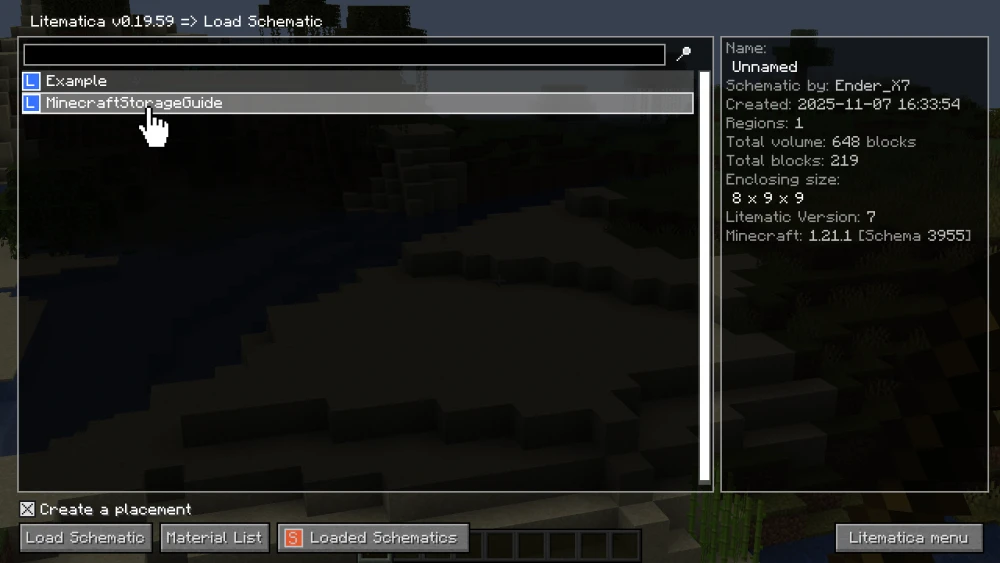 On the next screen, a list of available schematics will be given. Any .litematic file you have imported into the .minecraft/schematics folder will appear here.