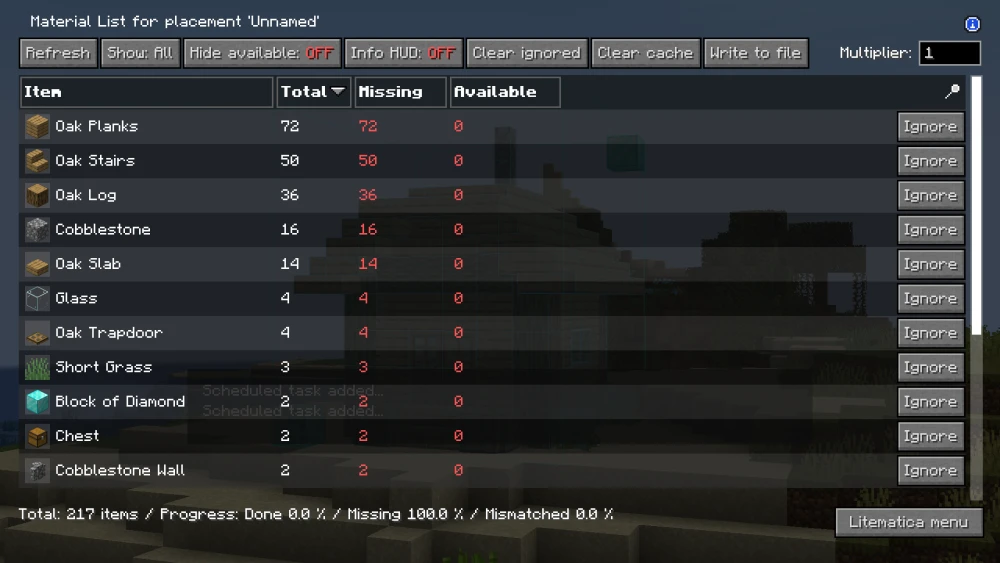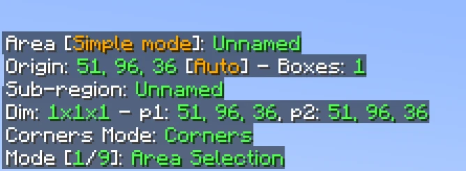 One of the perks of the Litematica mod is it's ability to give you a list of materials that are included in the selected area. This basically allows you to know the required amount of individual blocks before you start building.