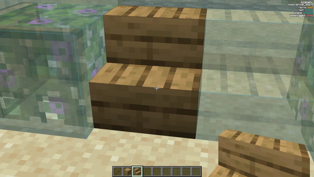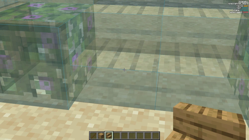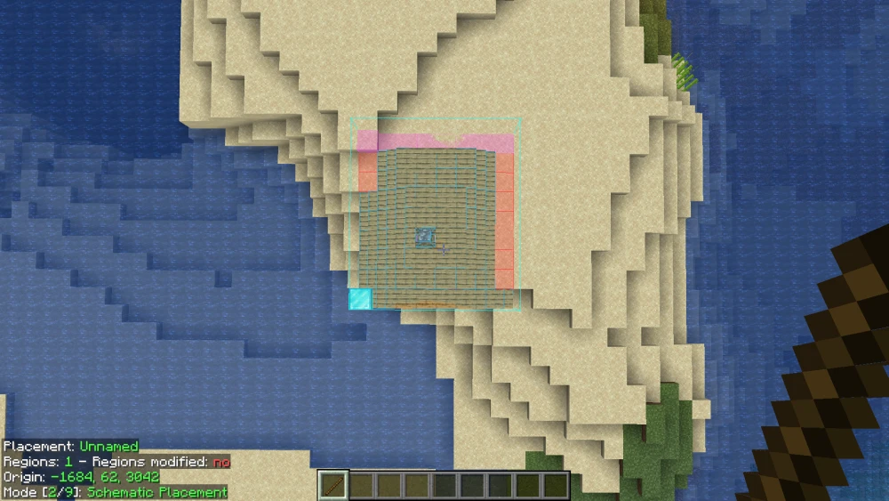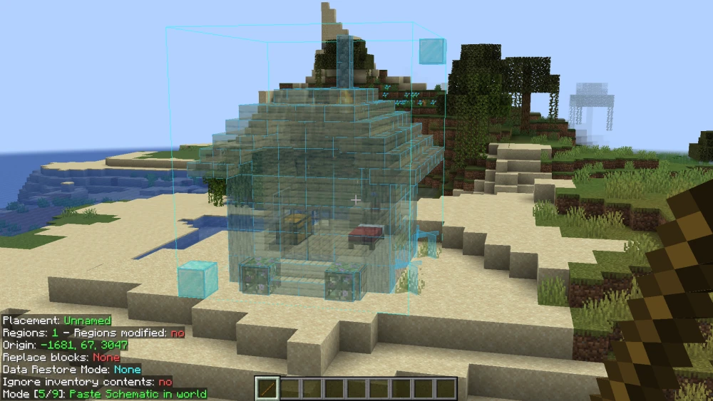 As mentioned above, the translucent schematic is very helpful when building in survival. As you can see, when the correct block is placed, the schematic for that block turns opaque.