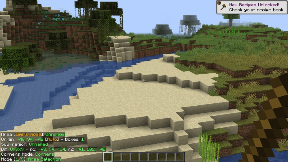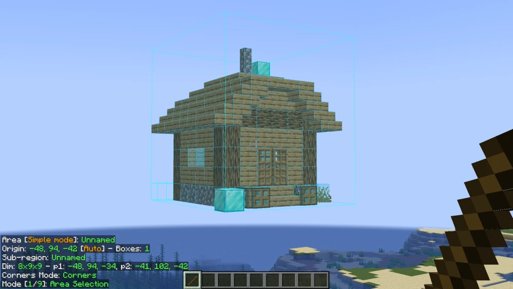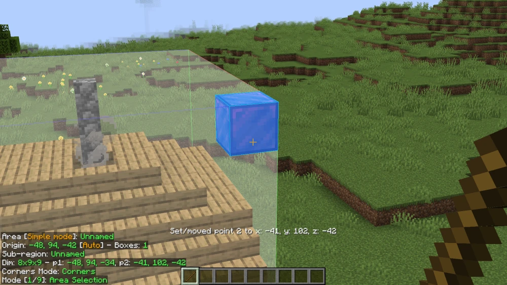 The first step is to select an area for copying. In our example, we will be selecting the three-dimensional area comprising of our build in World 1. For this, you first have to hold a stick in your hand and set it to Mode [1/9]: Area Selection.