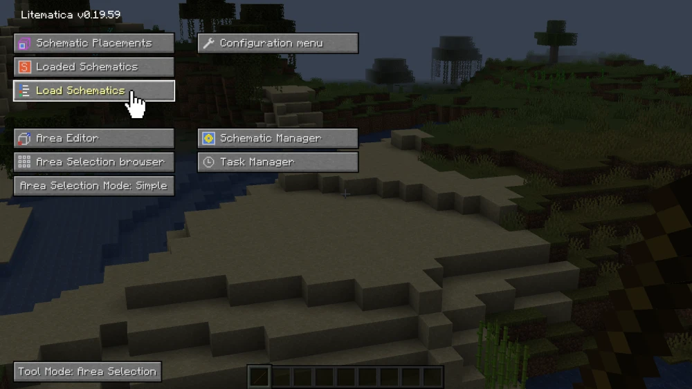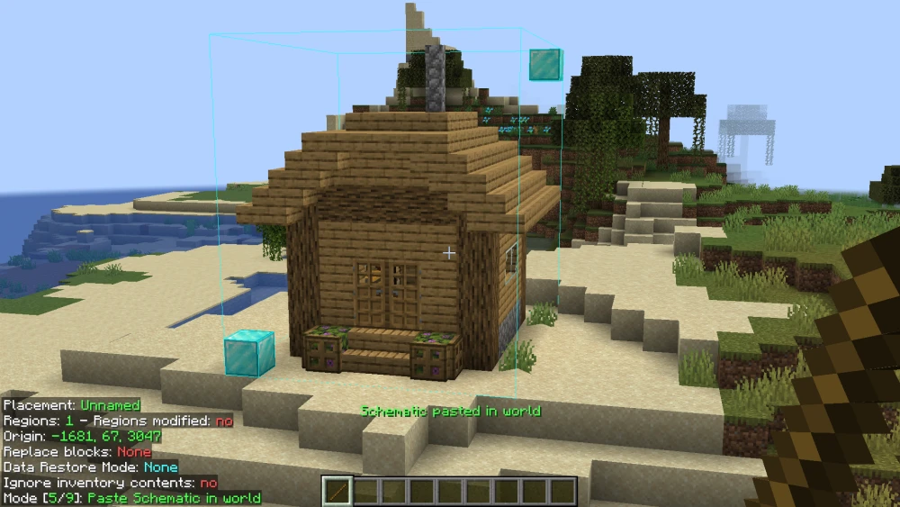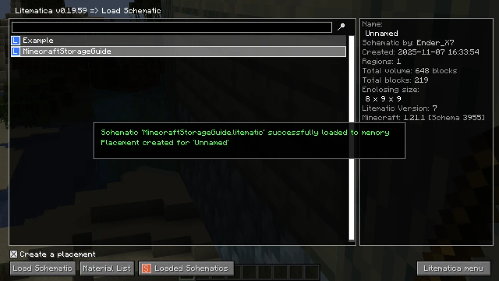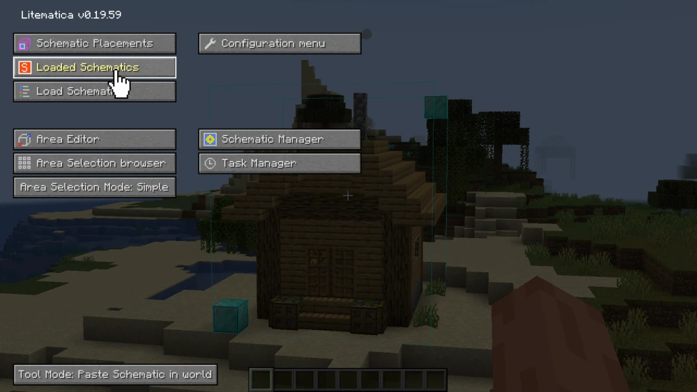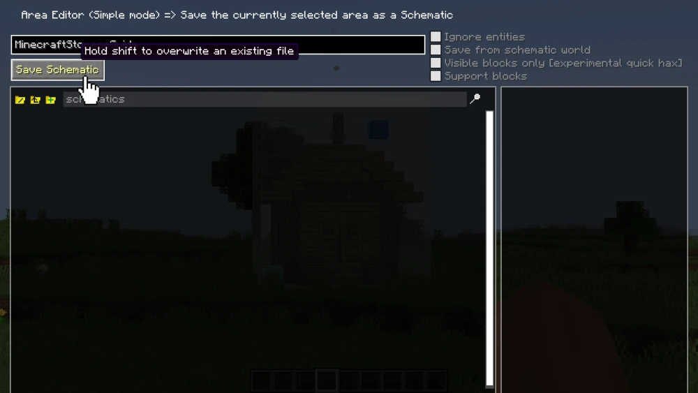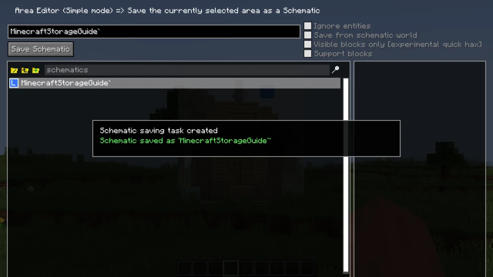 NOTE: The schematic you have saved must now appear as a .litematic file in the .minecraft/schematics folder. You can also add other .litematic files to this folder to import them into your game.