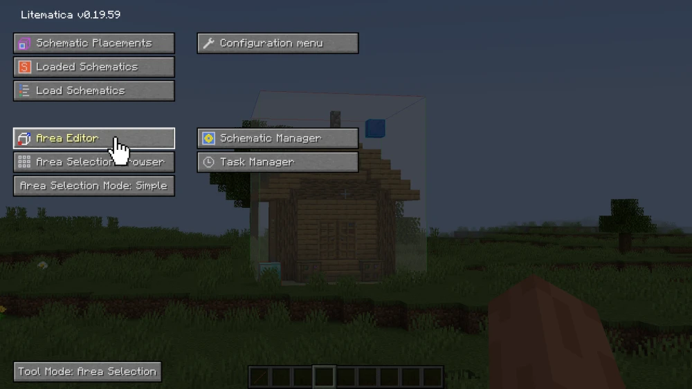 Press the M key to open Litematica settings. From here, click on the Area Editor button.