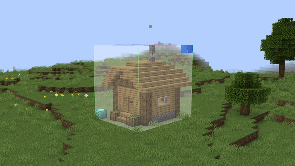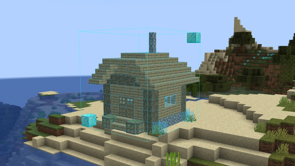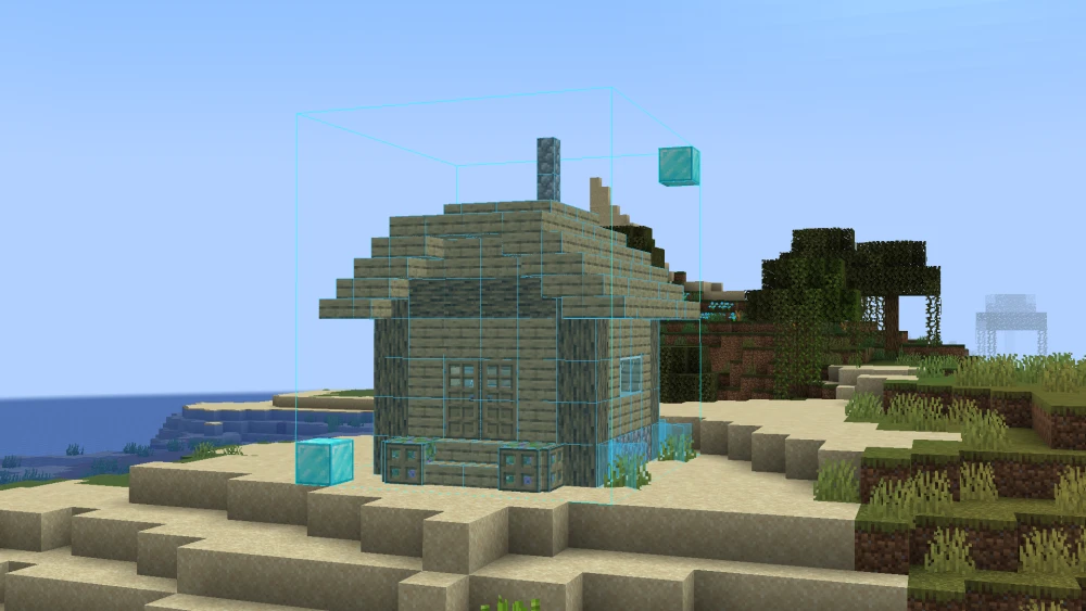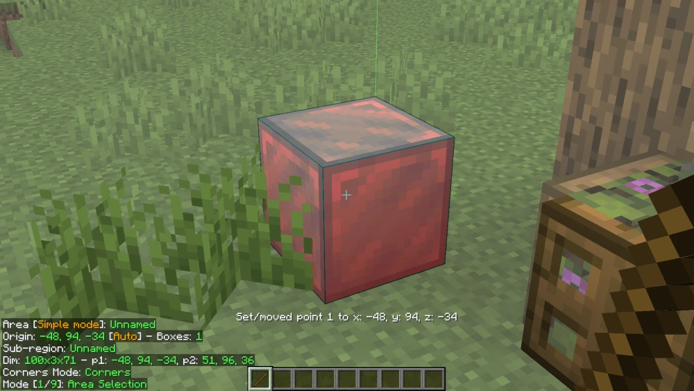 Now you can left-click on a block to set it as position 1 and left-click to set position 2. These blocks will be at two opposite corners of the area you are trying to select. Your goal here is to set position 1 and position 2 in such a way that the entire build is selected without any of the blocks hanging out.
