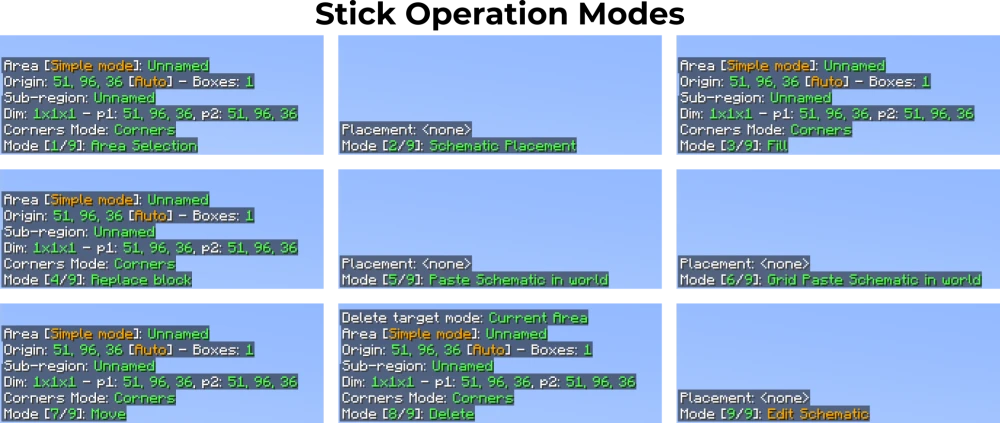 The main tool used for performing different operations in the Litematica mod is a simple wooden stick. Hold a stick in your hand, press and hold down the ctrl key, and scroll the mouse wheel to cycle through the various operation modes available. A total of nine operation modes are available and you have choose the correct one to perform the required operation.