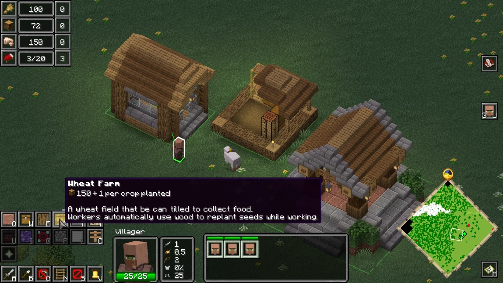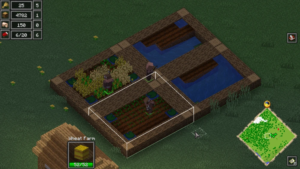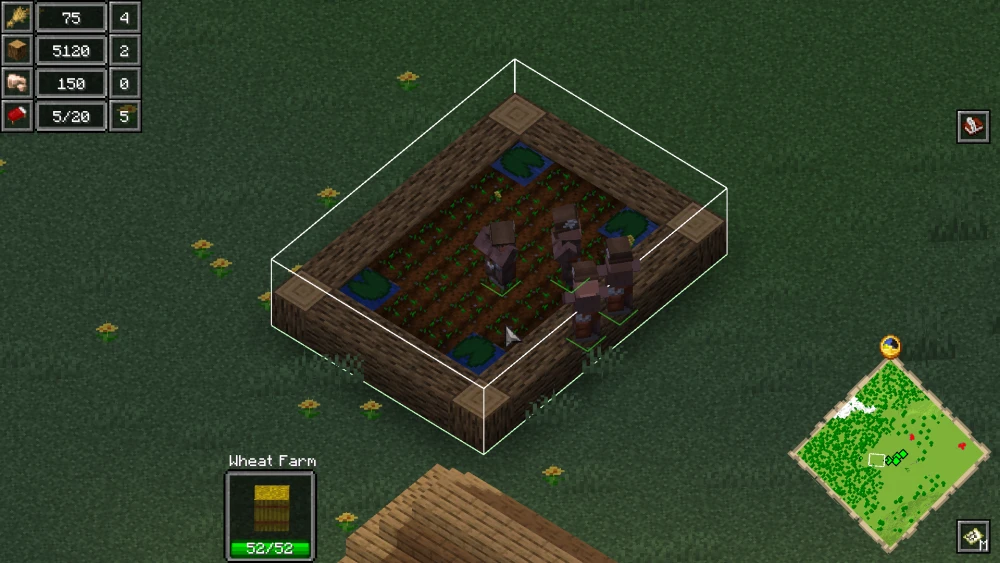 Once at least one wheat farm is placed, you can select a villager (or multiple villagers) and right-click on the wheat farm hitbox to assign them the job of farming. They will collect food (wheat) and deposit them in the stockpile. It is recommended to build multiple wheat farms and assign multiple villagers to increase food production rates.