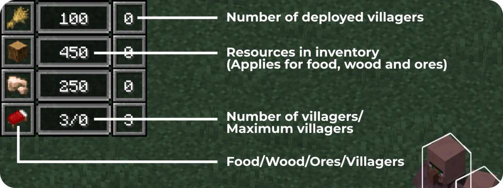 The left-most column shows the resource. The wheat icon is food, oak log icon is wood and raw iron icon is ore. The bed icon allows you to track your villagers. The second column shows the amount of resources you have collected. You will already have some resources when you first begin your game. The third column shows the number of villagers you have deployed to collect the respective resource.