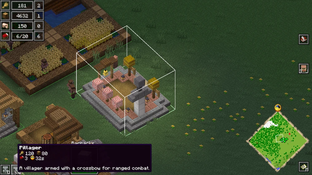 Once the barracks are constructed, you can left-click on them to open their interface, where you will find two buttons for Pillagers and Vindicators. You can summon the one of your choice by clicking on these buttons.