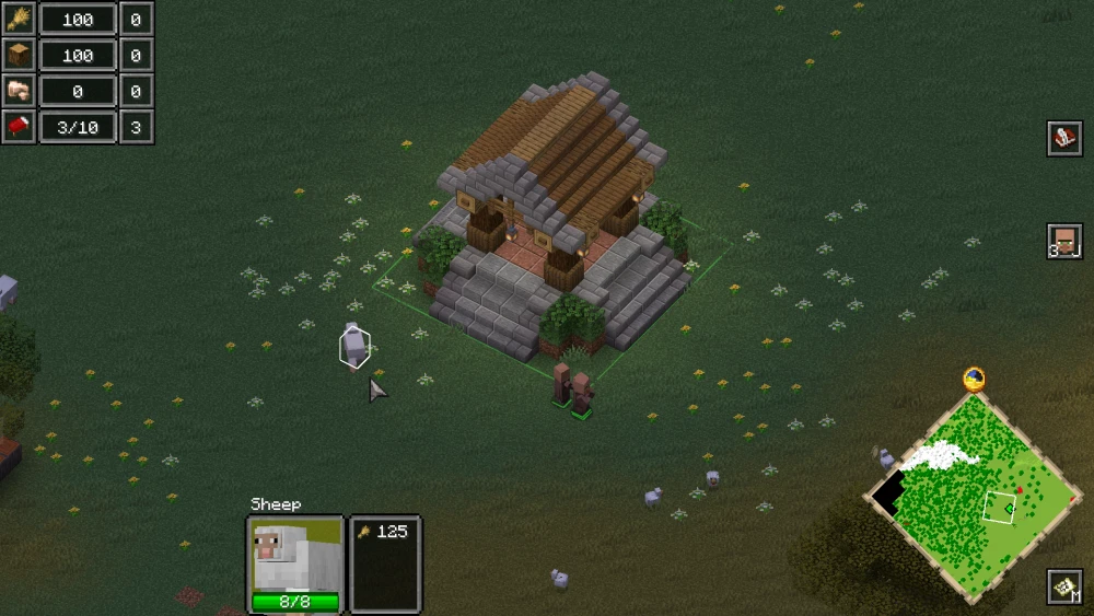 When the townhall is completed, you will notice that some other mobs, like sheep has been spawned in. But most importantly, the 3/0 shown for the bed icon in the resource count indicator has now increased to 3/10. This means you have increased the total limit for villagers in your faction to ten, basically allowing you to summon in seven more villagers to the already existing three.