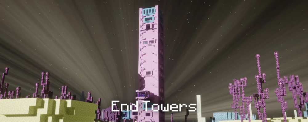 End Towers – Tall structures found in the End. These structures rise several stories above ground, and will (eventually) have a boss on the top level. Below them you'll find a network of labyrinths. Great treasures can sometimes be found in these mazes, for those who venture into them.