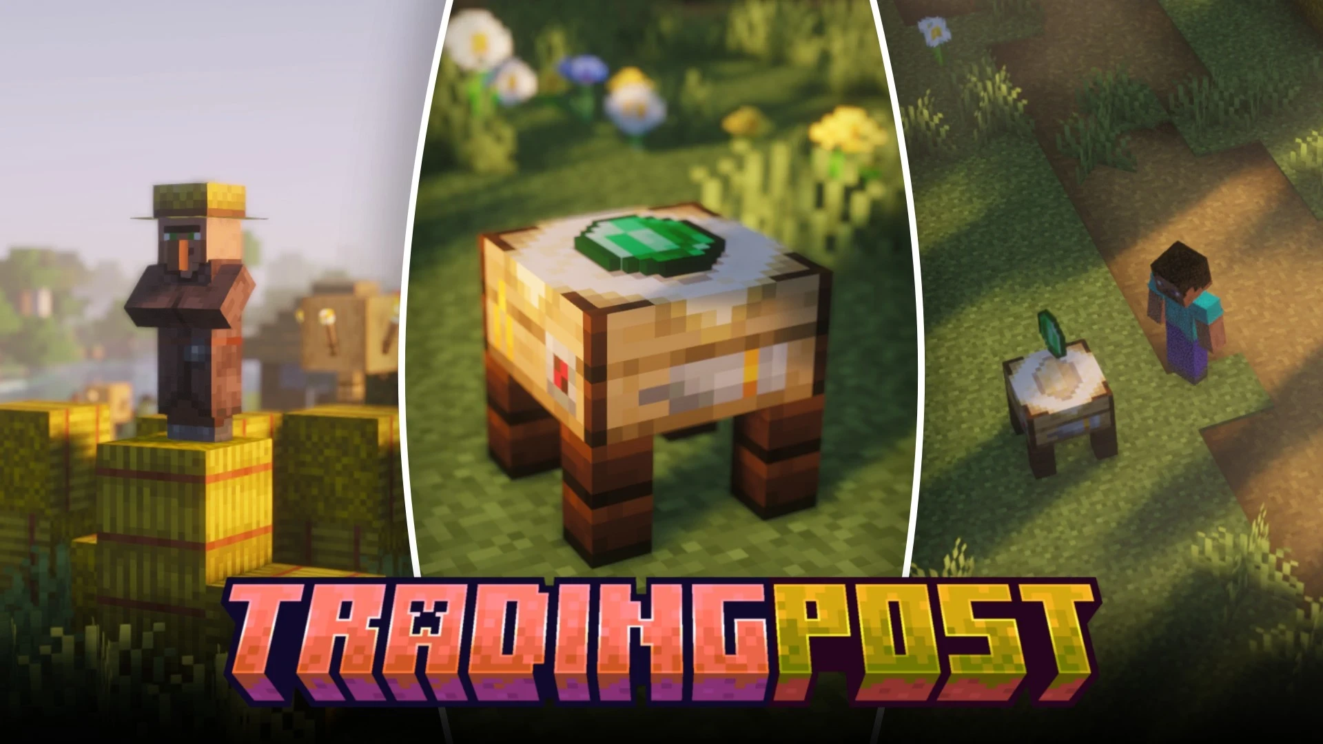 Using the recipe given below, a new block called the "trading post" can be crafted. This block basically allows you to trade with multiple villagers simultaneously, making it so that you do not have to search throughout the village to find that one villager you are looking for.
