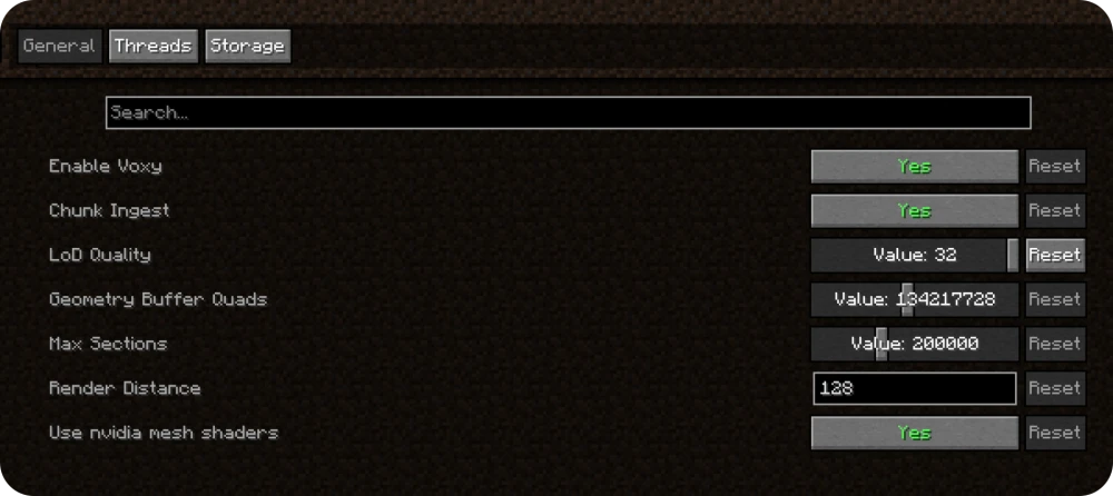 Geometry Buffer Quads: The amount of memory allocated on your GPU to store the shapes (quads) of the distant terrain. Lower values might result in LoD chunks flickering. Choose a value based on your Voxy render distance.