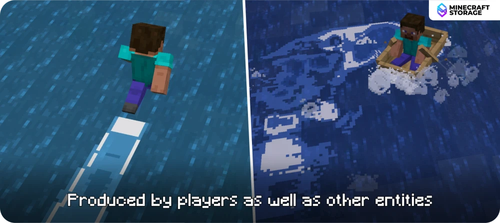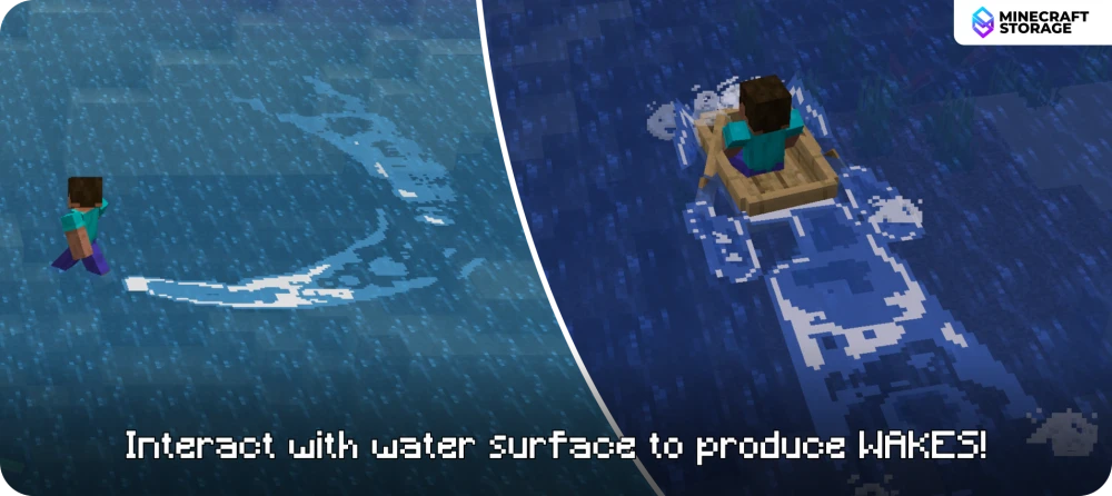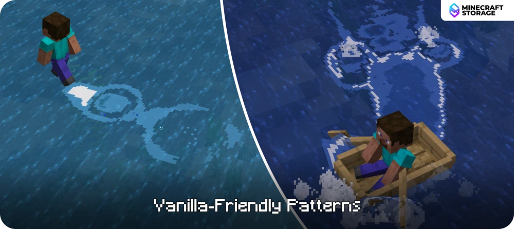 With this mod installed, when a player, mob or entity touches the water surface, it produces beautiful patterns, called "wakes". The wakes are generated along with a few splash effects and the combined effect makes interacting with water a lot more fun. All of the patterns generated fit the vanilla game very well.