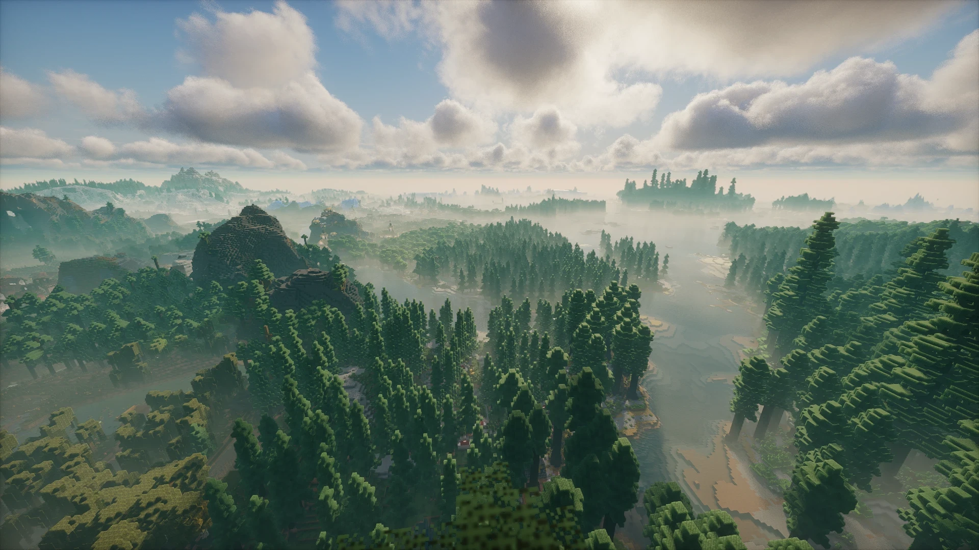 Объёмное освещение и облака, реалистичная луна и затмения. Наслаждайтесь реалистичной визуальной эстетикой в сочетании с невероятно большим расстоянием отрисовки, которое обеспечивается Voxy или Distant Horizons.